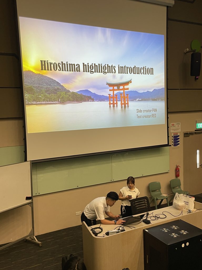SP校との文化交流会において、本校の学生たちは広島の紹介をした後、ツルの折り紙、福笑い、竹とんぼを紹介しました。