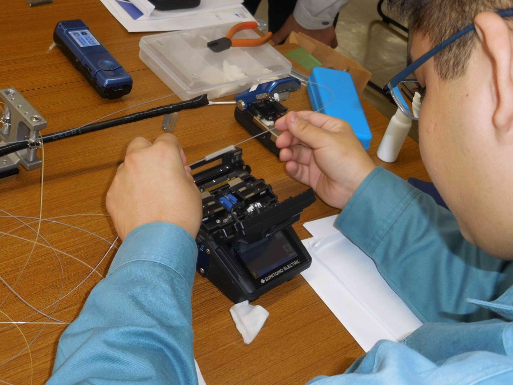 学生たちにとっては,光ケーブル接続は初めての体験であり,大変な興味をもって取り組んでいました。また,最後に模擬通信線においても光ケーブル接続を行い,対向試験において減衰値を測定しました。学生たちは自分で接続したケーブルの結果に一喜一憂しながら楽しく授業を受けていました。