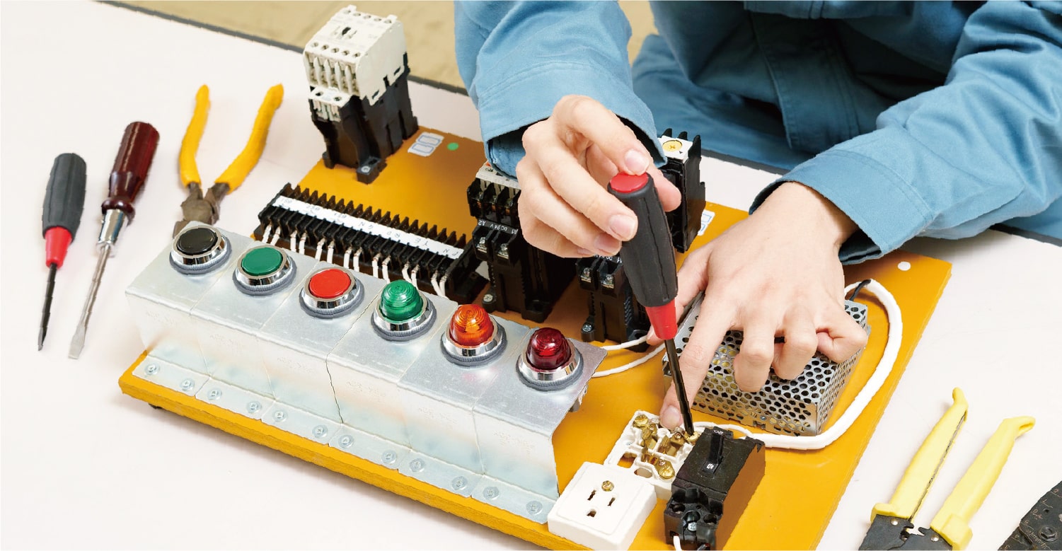 電気を扱うのに必要な基礎的な知識と技術を習得。高校で学んだ人、初めて学ぶ人それぞれの進度に合わせ学びます。