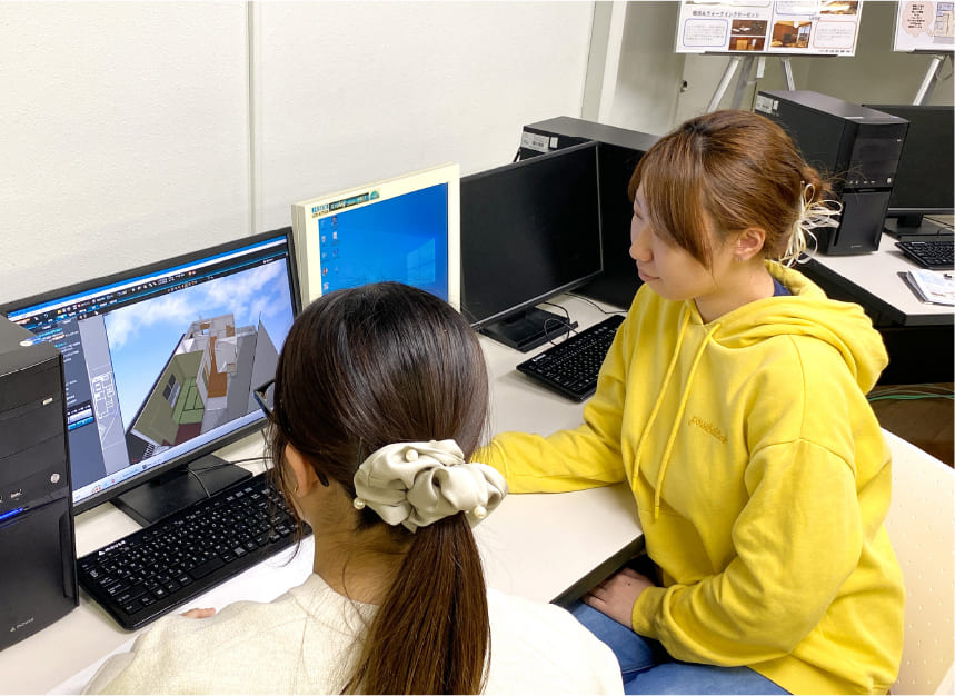 この教室のPCには、建築図面を入力することで建築物を立体的に表示できるソフトが搭載されています。このソフトを使うことで、建築物の外観だけでなく建築物の中も立体的に確認できるので、図面だけでは気付きにくい点などを知るのに役立ちます。