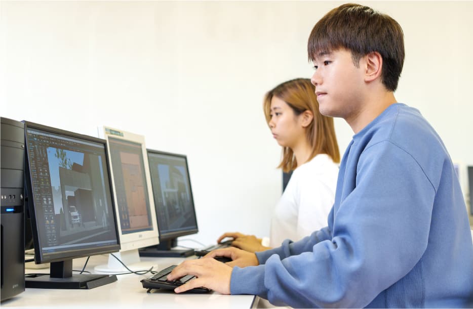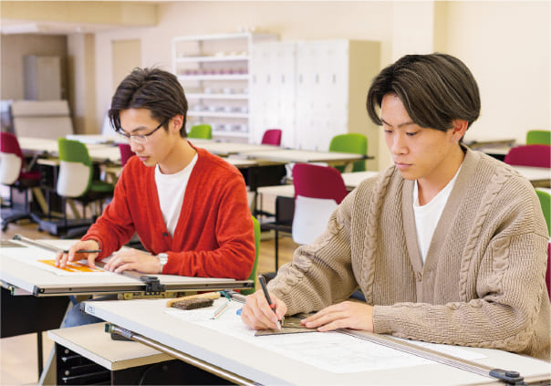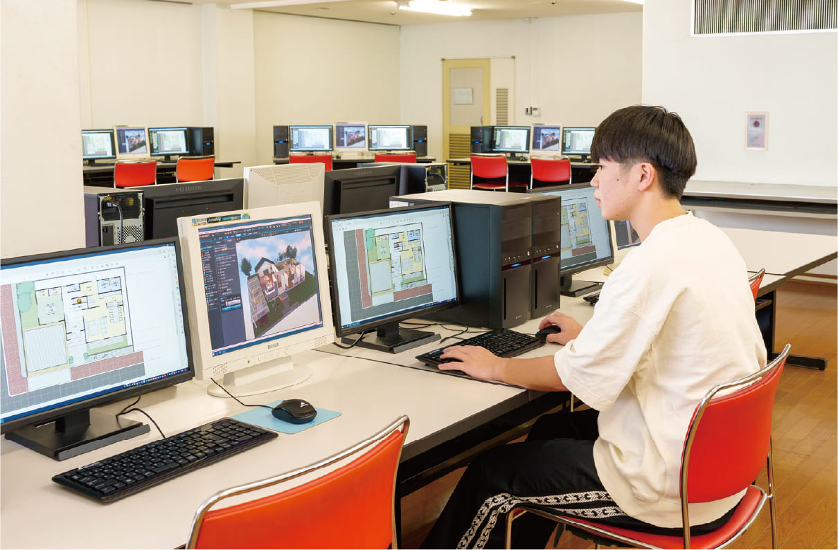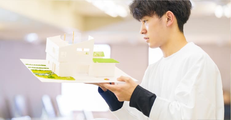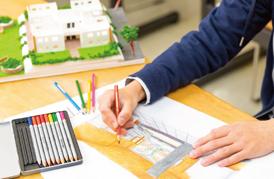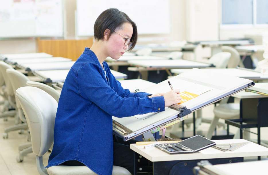 建築士の資格取得に有利な認定校として、建築における「設計」のスペシャリストを育てる学びの場を整えています。建築分野を総合的に学びながら、設計・製図・計画・材料・施工等の専門分野を集中して学べます。