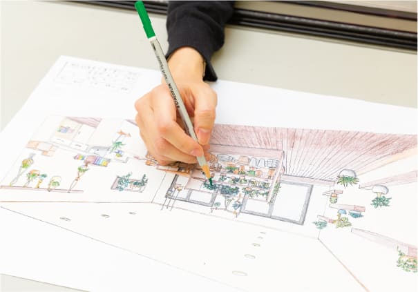 店舗や戸建て住宅などを題材に、建築デザイン専用の色鉛筆を用いて、外観や室内のイメージを描くテクニックを学びます。