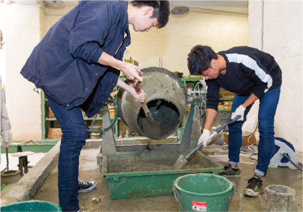 安全な建築物に必要な強度の基礎知識を学習。さまざまな条件でコンクリート実験や金属実験を重ね、材料の特性を学びます。