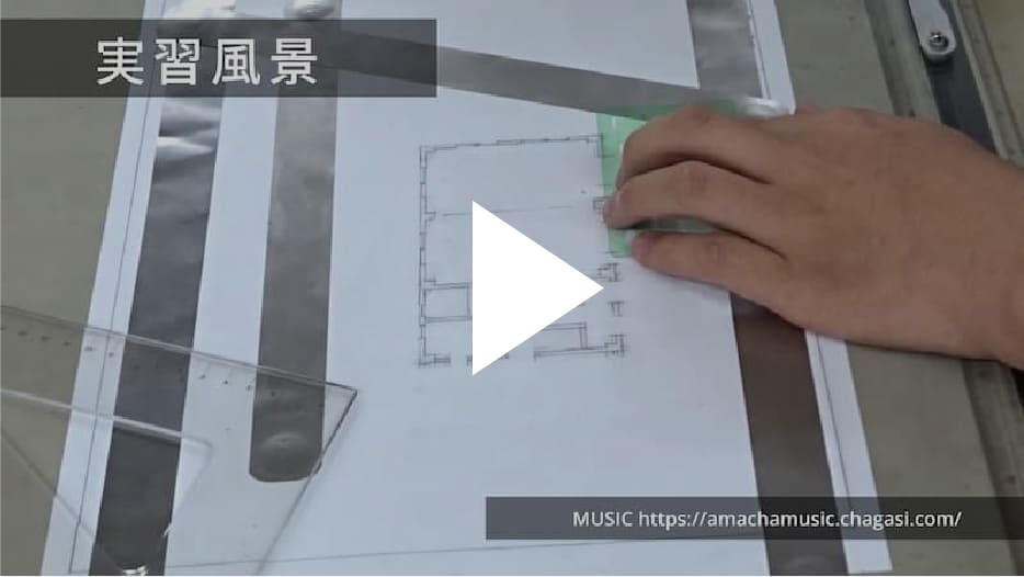 入学直後は線の引き方や製図文字の練習をします。製図の基礎を学んだ後、木造住宅や鉄筋コンクリート造などの図面を描いていきます。